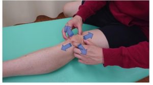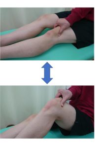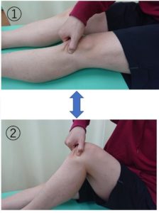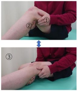 - お皿の上(膝蓋上包)をつまみ 屈伸する